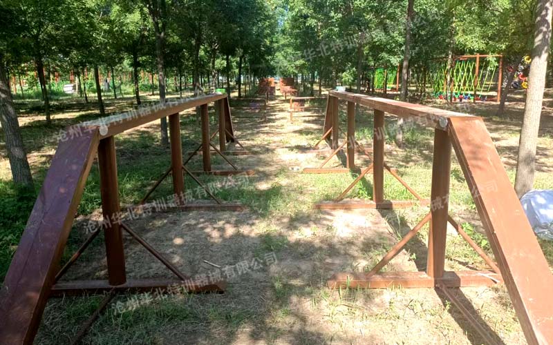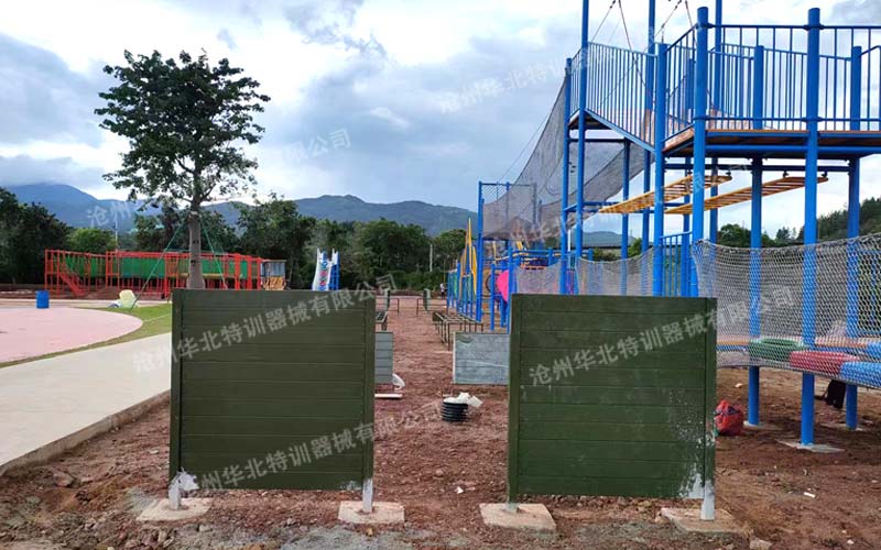 兒童國防軍事障礙單道場地長50米,寬2米。通常為雙道并列設(shè)置。項目依次為獨木橋、高欄、斜坡、地籠、矮墻、高板6個項目。