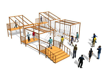 整體占地16米長×10.5米寬。吊樁秋千組合、吊樁秋千爬坡組合、獨木橋、人猿泰山、互動溜索。
