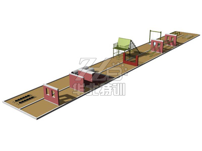 障礙場(chǎng)為100M*6M的長(zhǎng)方形。設(shè)二根障礙跑道,全程共設(shè)10個(gè)障礙物:跳輪胎→鉆管道→翻越屋脊(翻越天窗或爬樓梯)→蕩繩→過(guò)小道→爬天網(wǎng)→天橋→翻越隔離欄→斜坡