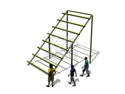 在高5米、寬3米、斜度45°的斜梯上,水平架設一組間隔0.5米的橫桿,各橫桿間距從上到下漸寬