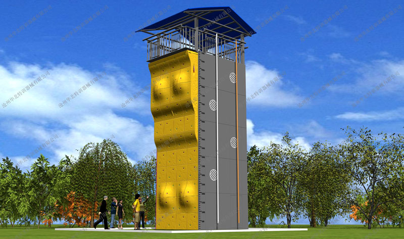 規(guī)格:總高12米(不含遮陽棚),平臺高10米。 器械含四面項目:造型攀巖、平面攀巖、趣味攀巖、速