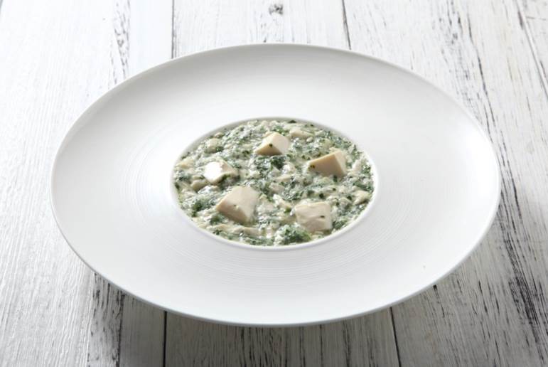 燒熱鍋加入上湯,鱈魚丁,薺菜末,調好味;