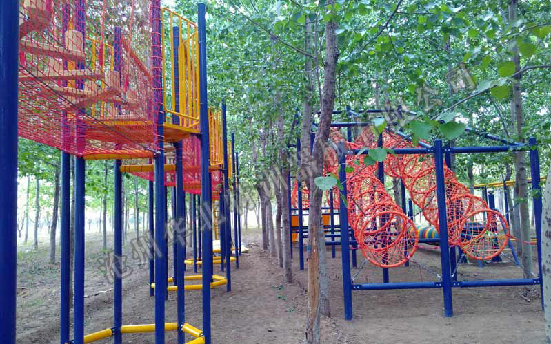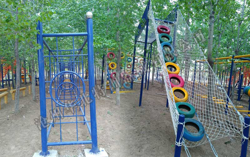 兒童拓展組合器械 田字型: 攀巖、時鐘搖擺、扭轉乾坤、輪胎路、吊索橋、滾筒、搶灘登陸、翹板橋、如履薄冰、腳吊環、弓形橋、鳳舞九天、網墻、吊樁、獨木橋、快樂星球、梅花樁、常青樹、風鈴、葫蘆、蜘蛛塔、爬梯、滑竿、23個項目。