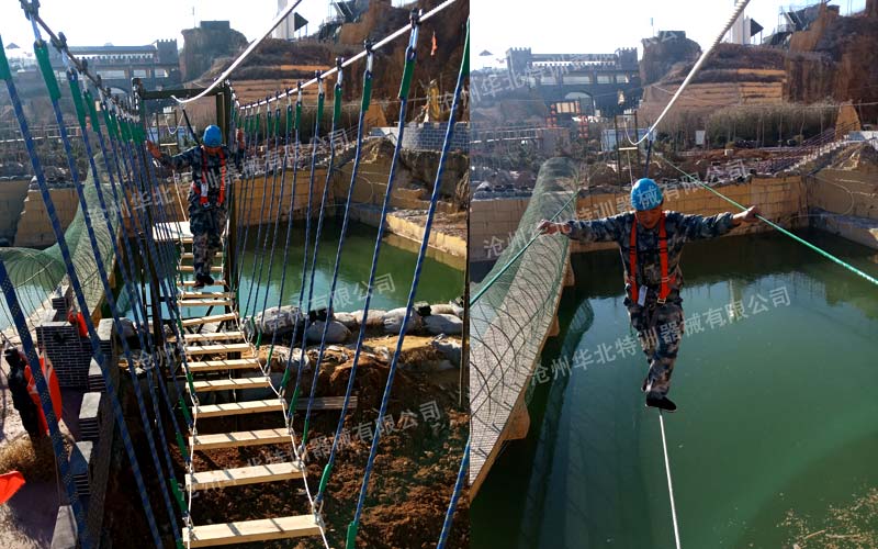 濟寧嘉祥富山國防教基地為豐富國防教育功能,在我公司(華北特訓)定制高空組合器械一套,空中穿越項目一套,青少年素質拓展器械--重走長征路一套現已建設完成,并投入使用。