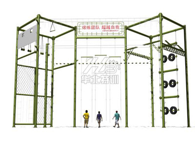 器械整體占地27米×9米×12米(高),最小場地需求30.6米×10米。主要項目:合力橋、單杠、斷橋、天梯、蕩木橋、繩網、吊索橋、相互依存、叢林繩、絕壁橫墻、軟