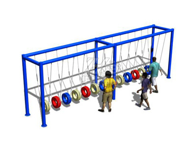 人員從吊樁一端手抓鏈條,腳踩吊樁,利用慣性通過倒換吊樁逐一通過,到達終點。