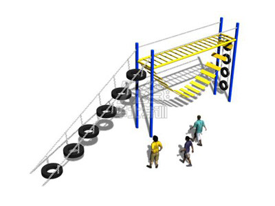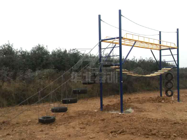 首先通過由輪胎連接而成的梯子,來到由木板拼接而成的吊橋,此時參訓人員可以有三種通過方式,一種方式為手握兩邊鏈條腳踩下方的懸空梯通過。或者僅憑臂力雙手交替前進通過懸空梯。最后一種為踩住下方來回晃動的木板吊橋通過,通過橋體以后,再爬下由輪胎組成的垂直梯子