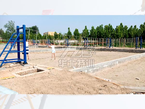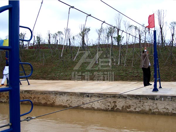 腳踩鋼絲繩,雙手握緊繩子,盡量繃緊繩子防止身體晃動(dòng),走到對(duì)岸