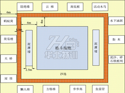 主要設置長方形訓練場坪、環形過道和泥潭(石子)鐵樁網、魚雷管、步步高、方格梯、懶人梯、屋頂、天橋、簡易樓、螞蟻窩、阻絕墻、云梯、高低樁、活動木馬、水下涵洞、拒木、泥潭壕等16組障礙,以及相應安全防護設施。