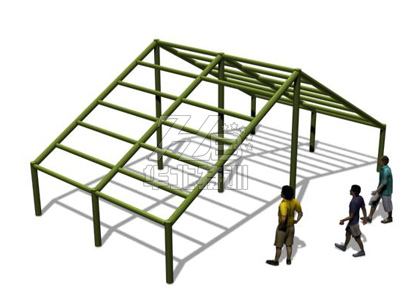 從屋檐爬上障礙,首先從第1根和第2根橫梁間翻至屋面下,而后從第2根和第3根橫梁間鉆出,依此交替通過,以鍛煉受訓者身體及四肢的協調能力